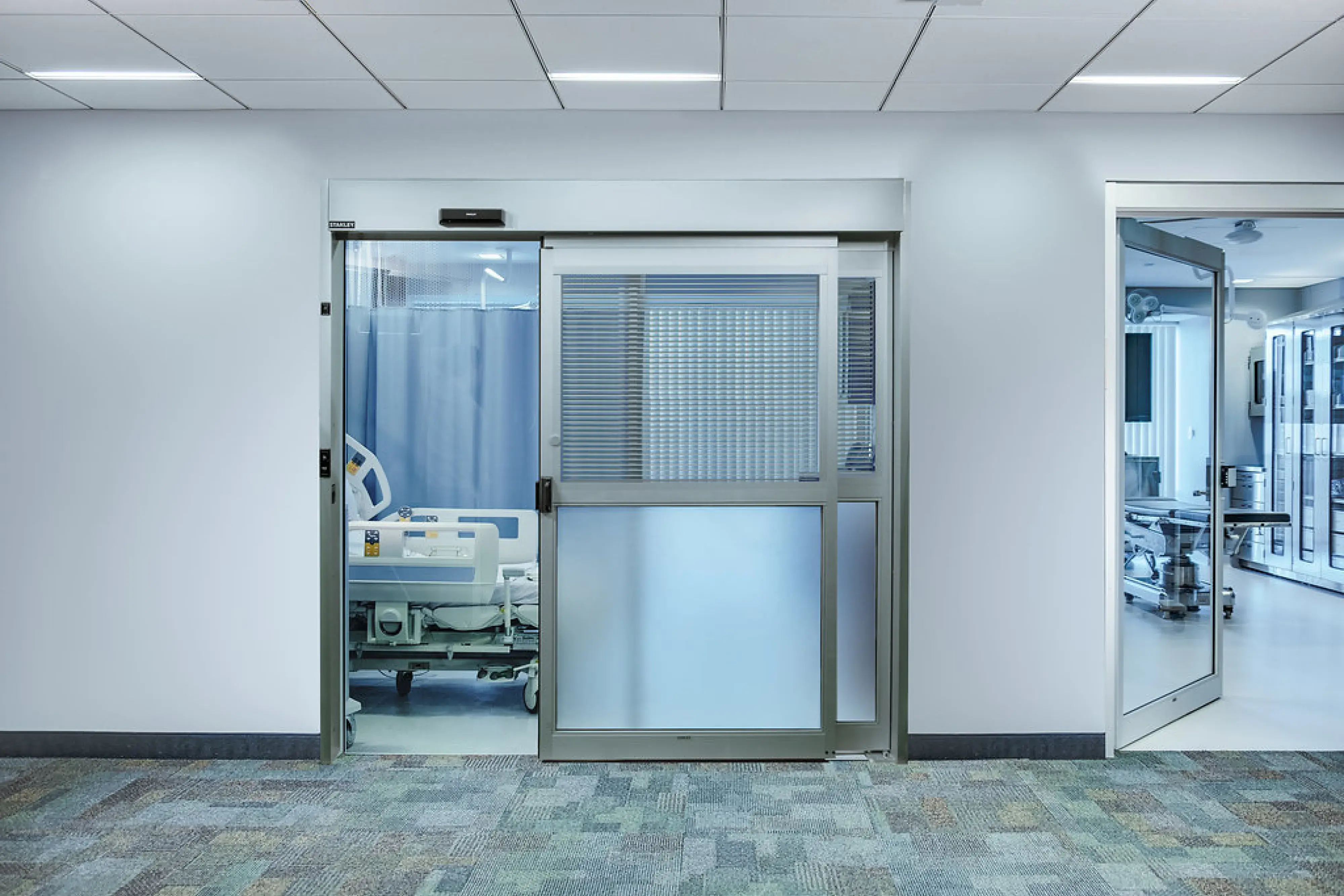 Enhanced visual privacy is one way to put the patient first. Electronic privacy glass, high-end integrated louvers (angled slats), and other available privacy features help shield patients from unnecessary visibility and support dignity during treatment and recovery. STANLEY’s ProCare series offers flexibility when it comes to visual privacy, with these options available for any part of the door, from a full panel to the upper part of the panel only.